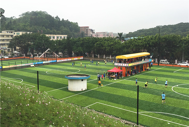 根据国际足联指定实验室labosport机构检测场地经验,在运动数据表现上,草坪和辅料填充占有相同的比重。因此要建造高质量的场地切不可忽略辅料填充的问题。在一般学校场地上,承包商为节省成本,在辅料填充上,一般都是石英砂20-25公斤,黑颗粒2-4公斤,这样做出的场地比较硬,脚感差,且容易板结,又由于草坪露的较长,没有得到很好的保护容易磨损影响了使用寿命,但是辅料也不是填的越多越好,如果填的过多,场地偏软,就像在被子上跑步,严重浪费人的体力;因此最合适的填充标准是石英砂25公斤/平方,橡胶颗粒5-8公斤/平方,辅料的高度在30-35mm,这样做出来的场地辅料高度适中,脚感舒适,且不容易,能使场地达到一个最佳的状态。